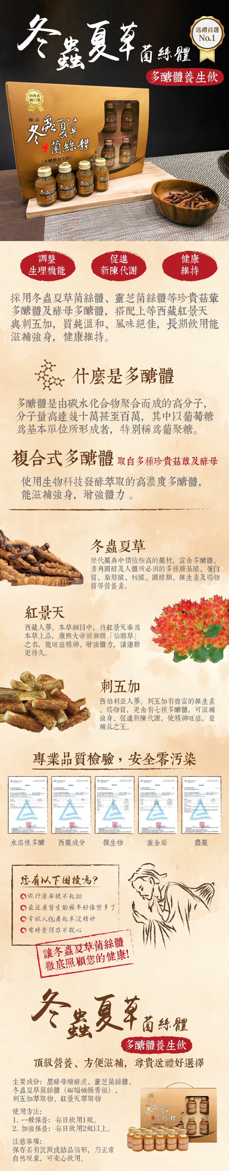 主要成份:黑酵母醱酵液、靈芝菌絲體、冬蟲夏草菌絲體(蝙蝠蛾擬青黴)、刺五加萃取物、紅景天萃取物