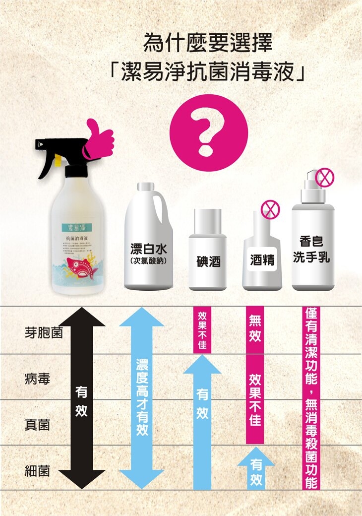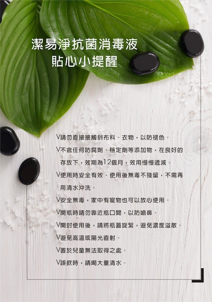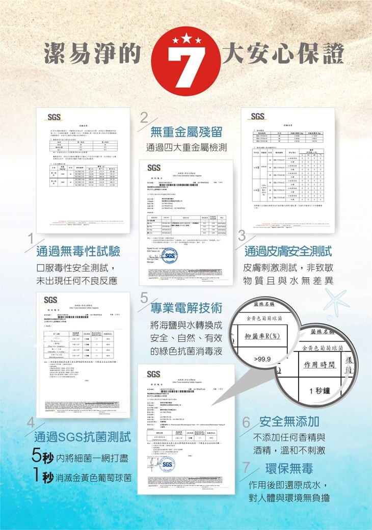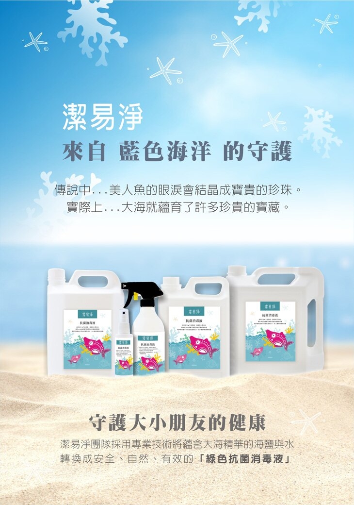 採用專業技術將蘊含大海精華的海鹽與水,轉換成安全、自然、有效的【綠色抗菌消毒液】。可直接噴於物體表面,無須稀釋,即可發揮抗菌清潔、除臭作用。