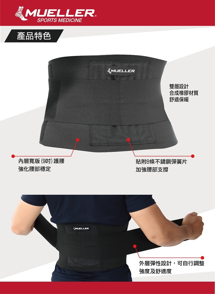 ● 外層4吋彈性加強護腰,可自行調整強度及舒適度
